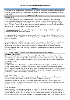 Detailed, concise and easy to follow notes for the exam. These notes include all elements of each offence and the relevant legislation. Further, they include a script and counterarguments that account for different possibilities that may arise in exam scenarios. This script helped me achieve a HD on the exam. Includes all topics relevant for the final exam: Topic 4- Elements of a crime Topic 5- Offences against the person (common law and statutory) Topic 6- Sexual offences Topic 7- Homicide Topic 8- Defences
