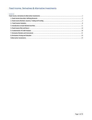 Details noted to help you prepare for the exams on this module. The following topics are covered in detail: 1. Fixed-Income Securities: Defining Elements 2. Fixed Income Markets: Issuance, Trading and Funding 3. Fixed Income Valuation 4. Introduction to Asset Backed Securities 5. Fixed Income Risk and Return 6. Fundamentals of Credit Analysis 7. Derivative Markets and Instruments 8. Derivatives Pricing and Valuation Investments