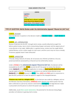 A comprehensive set of notes for the Admin exam. These long-form notes assisted me to achieve a score of 85 in Admin! I have made the notes logical and well-structured, and they cover all 12 weeks of lectures and sketch notes. NB: The sample of my notes includes: 2 pages of the 'Answer Skeleton; and about 4 pages of the 'Topic Notes'. These are random in order and not the way the actual notes are organised. What is included: 1. Topic Summaries (including lecture discussions and notes) for all essential topics over the semester: o Introduction to Administrative Law o Jurisdiction o Standing o Reasons for Decisions o Grounds of Review (pt 1, 2 and 3 - narrow and broad ultra vires) o Procedural Fairness o Jurisdictional Error o Remedies o Privative Clauses o Merits Review 2. Case Summaries: Clear case summaries (Facts, Issue, Held) included for ALL cases on the reading guide. From memory, Admin cases were tedious and long to read, so having an extract with ONLY relevant information in the case summaries is super helpful with revision: 3. Answer Skeleton: This answer skeleton took me HOURS to create and the part I primarily relied upon in the exam. It is colour coded and there is a legend on the top for how to follow the notes (as shown in the sample). Super easy to use and apply in stressful exam conditions, and ENSURE you don't miss vital pieces of information. Also super easy to adapt if there have been changes to the reading guide by following the legend. 3. Extracts of legislation: integrated into each topic (no need to carry a separate set of legislation, or scramble to find a particular subsection that relates to a topic). However please make sure you update according to changes in reading guide. Nb: Please note that the Admin exam usually carries a policy component on different topics each semester. I have included the notes for the topic the policy question was for my semester at the end of these NOTES, but this is LIKELY to have changed for you, please study accordingly. Good luck with the subject! and all your exams:)
