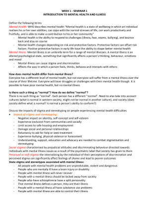 Notes compiled from twice-weekly seminars, week 1-6 from videos, weekly readings, and further reading. In-depth descriptions and nursing management. Topics covered are: - Legal and ethical issues: The Mental Health Act - Mental health assessment - Substance use and abuse & dual diagnosis - Psychosis and schizophrenia & medical and non-medical approaches to care - Depression - Bipolar Disorder - Stress and anxiety & medical and non-medical approaches to care - Personality disorder and self-harm - Eating disorders - Trauma-informed practice & emerging issues in health care
