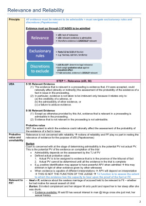 Comprehensive exam notes that cover ALL topics in LAWS2351 CPEP under the new TRIMESTER system. These notes concisely summarise the law in a logical and colour-coded format to help guide you through problem questions. Topics included: - Relevance and reliability - Credibility Rules and exceptions - Hearsay - Opinion - Character (good character) - Tendency and Coincidence - Identification - Questioning Procedures - Witness in court