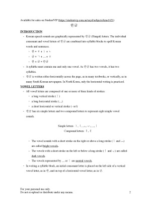 Will definitely help you heaps with revising vocabularies, grammatical structures, pronunciation rules, etc.! Table of contents Hangul Pronunciation rule Lesson 1: Greetings Lesson 2: The University Campus Lesson 3: Korean Language Class Lesson 4: At Home Lesson 5: At the Bookstore Lesson 6: My Day Lesson 7: The Weekend Lesson 8: In Seoul Grammar: condensed review Vocabulary: condensed review Included: all that you need to get top marks for this unit of study (vocabulary, grammar, expressions, pronunciation rules, you-name-it!) BONUS: Hanja for each vocabulary (if exist), very helpful for Korean learners with Chinese and Japanese background. Excluded: irrelevant details that won't help you score higher on your exam, anything that goes against Academic Honesty in Coursework Policy 2015 (assignments, exam questions, and exam responses). Again, perfect for getting a grasp of the course content and exam revision. Please do not re-upload this note or distribute it under any other means. I worked extremely hard for this high-quality note. Highly appreciated and best of luck with your study!
