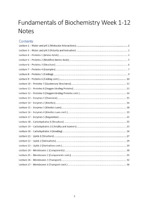 Comprehensive notes for Fundamentals of Biochemistry. Includes notes for all content from Week 1-12, with highlighted exam and study tips (incl. techniques and key concepts to focus on for improved efficiency, and common mistakes to avoid). Topics covered include: * Molecular Interactions (with a focus on water) * Polarity * Amino acids * Protein Structures and Levels * Protein Folding * Oxygen-Binding Proteins * Enzymes Kinetics * Conditions for Enzyme Functioning * Carbohydrates Structure and Nomenclature * Carbohydrate Isomers * Carbohydrate Bonding * Lipid Structure * Lipid Derivatives * Membrane Structure (and the fluid mosaic model) * Membrane Transport