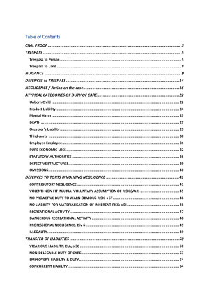 Complete notes! Perfect for your very straightforward and only includes what you need. No case facts or other useless things! Easy to understand :) Good Luck! TOPICS: CIVIL PROOF 2 TRESPASS 4 TRESPASS TO PERSON 5 TRESPASS TO LAND 7 NUISANCE 9 DEFENCES TO TRESPASS 13 NEGLIGENCE / ACTION ON THE CASE 15 ATYPICAL CATEGORIES OF DUTY OF CARE 22 UNBORN CHILD 22 PRODUCT LIABILITY 24 MENTAL HARM 25 DEATH 27 OCCUPIER'S LIABILITY 29 THIRD-PARTY 30 EMPLOYER-EMPLOYEE 31 PURE ECONOMIC LOSS 32 STATUTORY AUTHORITIES 36 DEFECTIVE STRUCTURES 39 OMISSIONS: 40 DEFENCES TO TORTS INVOLVING NEGLIGENCE 41 CONTRIBUTORY NEGLIGENCE 41 VOLENTI NON FIT INJURIA: VOLUNTARY ASSUMPTION OF RISK (VAR) 45 NO PROACTIVE DUTY TO WARN OBVIOUS RISK: S 5F 46 NO LIABILITY FOR MATERIALISATION OF INHERENT RISK: S 5I 46 RECREATIONAL ACTIVITY 47 DANGEROUS RECREATIONAL ACTIVITY 48 PROFESSIONAL NEGLIGENCE: DIV 6 48 ILLEGALITY 49 TRANSFER OF LIABILITIES 50 VICARIOUS LIABILITY: CLA, S 3C 50 NON-DELEGABLE DUTY OF CARE 53 EMPLOYER'S LIABILITY & DUTY 54 CONCURRENT LIABILITY 55 LIMITED LIABILITY 57 INTOXICATION: SS 47-50 (ALREADY DISCUSSED) 57 GOOD SAMARITANS: SS 56-58 57 VOLUNTEERS: SS 61-66 58 FOOD DONORS: S 58C 58 SELF-DEFENCE: SS 52-53 58 APOLOGIES 58