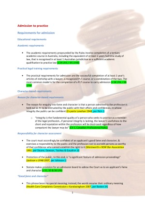 These notes are very detailed and comprehensive and provides plain English explanations for all legal concepts pertaining to professional responsibility and legal ethics. Notes are easy to read with various keys used to make it easy to scan through. For example, green represents a legislative reference whereas yellow represents a case discussion. Topics covered in these notes include: 1. Admission to practice 2. Requirements for admission 3. Factors relevant to good fame and character 4. Application for re-admission 5. Creation of lawyer-client relationship 6. The lawyer-client relationship 7. Lawyer’s duty to clients in tort