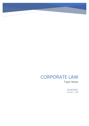Comprehensive corporate law notes which combine information from lectures, tutorials, readings and past exams to create well-structured exam notes. 📚 Using these notes I achieved an overall H1 86 mark, with 89% on the exam. 📚 For key topics, such as all directors' duties, dividends and class variations, the notes are set up as easy-to-follow, step by step guides to answering questions. 📚 Includes notes on reporting, disclosures and audit, which were non-examinable readings in the shortened Sem 1, 2020. I did this reading out of personal interest, and this has ensured the notes still FULLY COVER the course for later semesters. 📚 Has a self-contained section containing case summaries for easy reference in the exam. All cases are mentioned in the main body of notes, and in greater detail in the case summary section. Good luck with Corporate Law, and I hope these notes help you out!