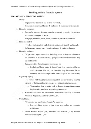 Will definitely help you heaps with understanding all the concepts, models, mathematical formulas, etc. being introduced to you in lectures and discussed in tutorials! (I scored 92% on my mid-semester exam and 96% on my final exam.) Table of Contents Topic 1: Banking and the financial system Topic 2: Money and the payment system Topic 3: Financial instruments, markets and institutions Topic 4: Interest rates and risks aversion Topic 5: Bond prices and yields Topic 6: Financial intermediation Topic 7: Bank management Topic 8: Financial industry structure Topic 9: Regulation of the financial system Topic 10: Central banks Topic 11: Money supply process Topic 12: Monetary policy Review (formula and condensed recap) Included: all that you need to get top marks for this unit of study (content summary, formula (with detailed step-by-step breakdown), study tips ... you name it!) Excluded: irrelevant details that won't help you score higher on your exam, anything that goes against Academic Honesty in Coursework Policy 2015 (assignments, exam questions, and exam responses). Again, perfect for getting a grasp of the course content and exam revision. Please do not re-upload this note or distribute it under any other means. I worked extremely hard for this high-quality note. Highly appreciated and best of luck with your study!