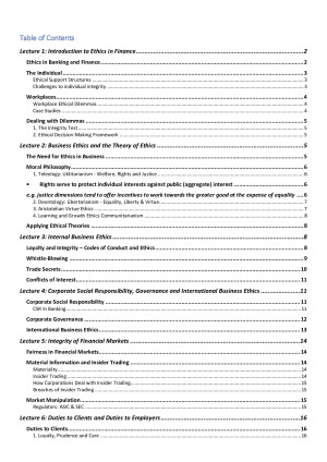 This is a comprehensive guide covering all topics in Ethics in Finance (Completed Winter Semester 2020). It includes: - definitions & explanations - qualitative methodology with compare & contrast tables - examples linked to CFA modules and different ethical frameworks All in an easy-to-read format with a table of contents to easily locate specific sections of notes on demand