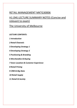 ✅Concise and relevant notes for Retail Management Exam ✅Covers all topics in detail and simplifies concepts to boost understanding Covers the following topics: -Introduction to Retail Management -Retail Channels -Developing Strategy 1 -Developing Strategy 2 -Positioning & Branding -Merchandise & Buying -Store Location & Customer Experience -Retail Pricing -CRM & Big Data -Retail Supply -Retail & Society I personally went through these notes a week prior to the exam to achieve a H1 (94). Goodluck!
