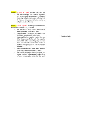 Complete summary of all E-Reserve Readings for this course. Very concise. Covers key points of all readings. Best for easy reference/recap. Includes readings by: -Hirschey, M. (1998). - Edelen, R. (1999). - Dimson, E., Marsh, P., & Staunton, M. (). - Eugene F Fama, K. R. F. (2004). - Gopalan, R., Song, F., & Yerramilli, V. (2014). - Brueggeman, W. B., & Fisher, J. D. (2019). - Cummings, J. R., & Ellis, K. (2015).
