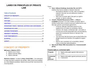 Condensed, yet detailed, notes that I used for LAWS1150 Final Exam. Relied on these notes to achieve a final mark of Distinction [80] - Concept of property - Privacy - Fixtures - Chattels - Possessory torts - Possession of land - Adverse possession - Property transfer - Part performance - Estoppel - Agency
