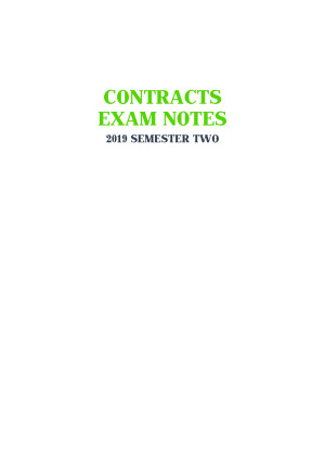 Up to date and most recent contracts notes from 2019 Semester 2. Notes are comprehensive but succinct, perfect for summarising topics or to use in the exam! They are organised in mind for quick application to hypothetical questions, outlining the steps you will need to undertake for each topic. I also have another set of CASE notes which outline the facts and judgments of each case from the reading guide in full detail. TOPICS INCLUDED: Incorporation Interpretation Implied terms Consumer protection Frustration Termination Mistake Vitiating factors (Duress, undue influence, third party misconduct, illegality) These notes are NOT within the definition of ‘assessment materials’ according the Melbourne Law School Assessment & Results Policy. They do not contain template style sections nor are they lecture transcripts. Therefore it is not a breach of s 42 of the Academic Board Regulation to purchase these notes.