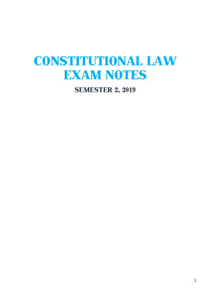 Super comprehensive but clear and concise notes for Constitutional Law from 2019, semester 2! The notes and cases are integrated for optimal reading and accessibility. Topics are structured in a way that is conducive to applying the theory and case law to a hypothetical - perfect for exams. INCLUDES handy issue spotting guide that is your go-to resource for hypos. If you like these, check out my other notes for 1st year JD subjects! TOPICS INCLUDE: Introduction to the Constitution Interpretation of the heads of federal legislative power External affairs power Corporations power Inconsistency of state and federal legislation Intergovernmental immunities Defences power Commonwealth executive power Separation of judicial powers Grants power Prohibition on the imposition of excise duties Freedom of interstate trade Freedom of political communication These notes are NOT within the definition of ‘assessment materials’ according the Melbourne Law School Assessment & Results Policy. They do not contain template style sections nor are they lecture transcripts. Therefore it is not a breach of s 42 of the Academic Board Regulation to purchase these notes.