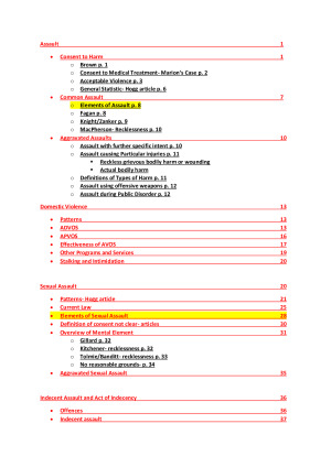 Detailed notes on following topics: 1. Assault 2. Domestic Violence 3. Sexual Assault 4. Indecent Assault and Act of Indecency 5. Murder 6. Manslaughter 7. Defences 8. Property Offences 9. Fraud 10. Group Liability Offences 11. Sentencing 12. KEY ISSUES FOR POLICY QUESTION