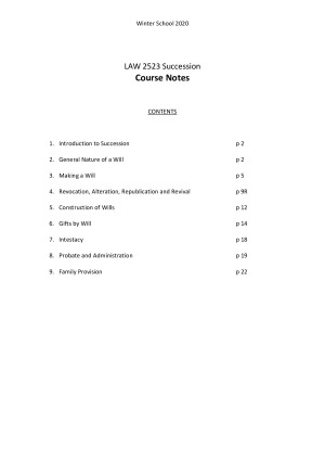 Clear and comprehensive Succession Law notes. Cover topics including: - Introduction to Succession - Nature of a will - Making of a will - Revocation, alteration, republication, revival - Construction of wills - Gifts by will - Intestacy - Probate and administration - Family provision