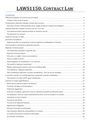 LAWS1150: CONTRACT LAW Contents Differences between the common law and equity Criticism of the courts of equity Contemporary Distinction between contract law & tort law Executory contract (nothing actually done): legally binding as a higher level obligation Classical Distinction between Contract Law from Tort Law Circumstances where classical analysis of contracts may fail The elements of a contract Cases for formation of offer Overview of acceptance Determining offer and acceptance: external (objective) manifestations of intention Communication of acceptance (generally required) Methods of Communication The Postal Rule (exception to general rule) Electronic Communications Who wins in a ‘battle’ of terms and conditions What is a battle of forms? Deed (safeguard of consideration is not required) The benefit or detriment requirement Bargain requirements (‘quid pro quo’) and conditional gifts The sufficiency / adequacy distinction Past consideration (generally not good consideration) – the rule and an exception A promise to perform an existing legal duty is generally not good consideration Part payment of a debt is NOT good consideration Intention to Create Legal Relations What may be used as evidence of intention? The Role and Nature of Presumptions Preliminary Agreement Overview of Certainty: agreement must be sufficiently complete & sufficiently certain Completeness: there are certain essential terms which must be included in a contract Uncertainty (or lack of clarity) Severance and Waiver The use of an Objective Standard Agreements to Negotiate B Illusory Promises (unenforceable) How Discretion affects the enforceability of a contract An illustory promise will not itself be enforceable. An overview of discretion A Overview: There are two requirements to enforce a promise B When the privity rule does not pose an obstruction Ways around the privity rule (enforcing a contract outside the tent) What is property? Property Rights and Contractual Rights Licences Definitions - What is property? Property in Philosophy and history Public Rights Under common law, everyone has right to fish/navigate the sea. Is it a property right? Public vs. property rights Property Rights When do these questions matter? In what sort of circumstances? Is property only about property rights? What sort of things can be the object of property? Rights In Rem and Rights In Personam What is a licence? What is a difference between a licence and an interest in land? Does an irrevocable contractual right may confer property rights? Numerus Clausus Principle – landowners cannot create new types of property rights Property Rights and the Rights of Persons Are persons property? (policy qs?) Judgment - Lord Buckmaster LC What to take from this case? Differences between property and licences Property rights and the rights of persons (M Davies and N Naffine) Property and body parts are not property but can be stolen; should not be sold Holding and Rule (Panelli) Rule for Conversion Public Policy 3:2 decision. What could the racecourse have done, and what could they do today, to protect themselves? Human rights law regard property as a human right Boundaries of land ( above and below your land) What constitutes a fixture? Must be attached to the land When does a chattel become a fixture: Tenant's fixtures Accidental fixtures: General rule: If you accidently affix an object onto your land -> it’s the land owner’s property. Brand v Chris Building Co. Ltd. (1957) Facts: Built building on wrong land. Held: If the builder went to go destroy the building it would be considered trespass. Issue: Brand did not know that the building was being built on his land -> unjust enrichment. How far does ownership of land extend upwards: to the use and enjoyment of the land. (below a certain height it will be considered trespass). Problem Split it and find the factors for fixture/ chattel -> under property law if it is a fixture and part of the land it overrides contract law. Kaye J: the relevant intention cant take into account of agreement Types of possession Bailments (lending an item to someone else) The plea of jus tertii (cannot be pleaded in Australian jurisdictions: Perry v Clissold) Actions in property Negligence – breach of duty of care – actual and immediate possession Eg. A owns and lends truck to her brother B. Without permission, C takes truck from B. A= Bailor, B= Bailee Eg. A leases truck to B for 6 months. . Without permission, C takes truck from B. A= Bailor, B= Bailee B has actual possession. -> can sue for trespass. Eg. A leases truck to B for 6 months. . Without permission, C takes truck from B. Six months passed. . Cases relevant to the Just Tertii Defence (no longer applicable in Australia) Claims by a bailee against a third party Claims by a bailor against a bailee The amount of the damages (see Winkfield) The rights of a finder – Finders keepers (except for the rightful owners)! Overview of possession Obtaining or recovering possession Historical evolution Suspended orders (giving you time to move out) for squatters as opposed to lessors Self Help (forcible re-entry) A. Title in action to recover possession of land Relativity of titles under the Torrens system Assignment of the interest of a person dispossessed by a squatter Nature of possessory title Arguments for and against adverse possession – Policy question? Adverse possession and good faith Commencement of the limitation period General principles Persons presently entitled to possession The elements of adverse possession NSW law generally only allows adverse possession for whole parcels of land Does possession of part-parcel of a lot amount to possession of the whole? Future interests Equitable estates Adverse possession by a co-owner Successive adverse possessors Stopping time running Extension of time The effect of effluxion of time Tenancies • It is not possible to determine questions of priority until the nature of the acquisition and tr