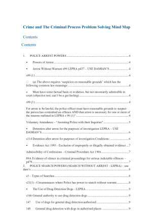 Contents 1. POLICE ARREST POWERS ▪ Powers of Arrest ▪ Arrest Without Warrant s99 LEPRA p437 – USE DAMIAN’S s99 (1) • (a) The above requires ‘suspicion on reasonable grounds’ which has the following common law meanings: o Must have some factual basis or evidence, but not necessarily admissible in court (objective test; can’t be a gut feeling) s99 (1) For arrest to be lawful, the police officer must have reasonable grounds to suspect the person has committed an offence AND that arrest is necessary for one or more of the reasons outlined in LEPRA s 99 (1)” Voluntary Attendance – “Assisting Police with their Inquiries” ▪ Detention after arrest for the purposes of investigation LEPRA – USE DAMIAN’S s114 Detention after arrest for purposes of investigation Conditions: ▪ Evidence Act 1995 - Exclusion of improperly or illegally obtained evidence Admissibility of Confessions – Criminal Procedure Act 1986 89A Evidence of silence in criminal proceedings for serious indictable offences – p479 2. POLICE SEARCH POWERS (SEARCH WITHOUT ARREST - LEPRA) – use dam’s s3 – Types of Searches s21(1) - Circumstances where Police has power to search without warrant ▪ The Use of Drug Detection Dogs - LEPRA s146 General authority to use drug detection dogs 147 Use of dogs for general drug detection authorised 148 General drug detection with dogs in authorised places ▪ Arrest and Exercise of “Reasonable Force” - LEPRA ▪ Move-Along Powers – s197 LEPRA ▪ Riot and Affray s93 LEPRA S93B Riot: S93C Affray: S93D Mental Element S545C Crimes Act – Unlawful Assembly 4. COMPONENTS OF AN OFFENCE – STRUCTURE OF YOUR ANSWER 2. Actus reus 3. Mens rea 4. Coincidence (only deal with this if it is an issue) - using 5. Defences OFFENCES 1. Public Order Offences Summary Offences Act 1988 (SOA) OTHER RELEVANT FACTORS LEPRA - Powers relating to intoxicated persons LEPRA - Emergency Alcohol Free Zones Destroying or damaging property 2. Drug Offences Summary Offences Indictable Offences – Prohibited Plants Indictable Offences – Prohibited Drugs 3. Criminalising Association Association for terrorist purposes a. Membership of a terrorist organisation Associating with a member of a terrorist organisation Consorting – Crimes Act 93W Definition 93X Consorting 93Y Defence Participation in a Criminal Group – Crimes Act Current regime – pg 1220 Restricted Premises Act 1943 – pg 1223 Circumstances Times not taken into account Conditions