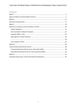 Contents Week 7 2 Agency Problem and Shareholder Activism 2 Week 8 11 Executive Compensation 11 Week 9 18 Market for Corporate Control (Takeover Threat) 18 Hostile Takeovers 21 Some Australian Takeover Examples 22 Example: AMP vs. GIO 23 Fight Against a Hostile Takeover 24 26 Price Impacts of ATPs 26 Week 10 28 Concentrated Ownership & Control 28 Concentrated Ownership Structure: Microsoft (1995) 30 Pyramidal Ownership Structure: Samsung Group (2002) 33 Week 11 35 Corporate Governance: Some International Perspectives 35