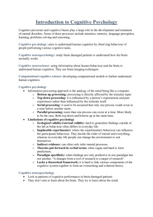 Cognition is a very complex and abstract area of psychology. I poured an immense amount of time into writing these notes to ensure that they were detailed and comprehensive. I achieved a final grade of 88% for this unit, which upon reflection, was largely thanks to my notes. These notes cover the following topics: • Theories of cognitive functioning and processes • Perception • Attention • Memory • Problem-solving • Decision-making • Language • Learning