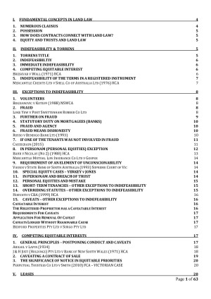 I. FUNDAMENTAL CONCEPTS IN LAND LAW 4 1. NUMEROUS CLAUSUS 4 2. POSSESSION 5 3. HOW DOES CONTRACTS CONNECT WITH LAND LAW? 5 4. EQUITY AND TRUSTS AND LAND LAW 5 II. INDEFEASIBILITY & TORRENS 5 1. TORRENS TITLE 5 2. INDEFEASIBILTIY 6 3. IMMEDIATE INDEFEASIBILITY 6 4. COMPETING EQUITABLE INTEREST 6 BRESKVAR V WALL (1971) HCA 6 5. INDEFEASIBILITY OF THE TERMS IN A REGISTERED INSTRUMENT 7 MERCANTILE CREDITS LTD V SHELL CO OF AUSTRALIA LTD (1976) HCA 7 III. EXCEPTIONS TO INDEFEASIBILITY 8 1. VOLUNTEERS 8 BOGDANOVIC V KOTEFF (1988) NSWCA 8 2. FRAUD 8 LOKE YEW V PORT SWETTENHAM RUBBER CO LTD 8 3. FURTHER ON FRAUD 9 4. STATUTORY DUTY ON MORTGAGEES (BANKS) 10 5. FRAUD AND AGENCY 10 6. FRAUD MEANS DISHONESTY 10 RUSSO V BENDIGO BANK LTD (1993) 10 7. IF ONE OF THE TENANTS WAS NOT INVOLVED IN FRAUD 11 CASSEGRAIN (2015) 11 8. IN PERSONAM (PERSONAL EQUITIES) EXCEPTION 12 BAHR V NICOLAY (NO 2) (1988) HCA 13 MERCANTILE MUTUAL LIFE INSURANCE CO LTD V GOSPER 14 9. REQUIREMENT OF AN ELEMENT OF UNCONSCIONABILITY 14 VASSOS V STATE BANK OF SOUTH AUSTRALIA (1993) SUPREME COURT OF VIC 14 10. SPECIAL EQUITY CASES – YERKEY V JONES 14 11. IN PERSONAM AND BREACH OF TRUST 14 12. PERSONAL EQUITIES AND MISTAKE 15 13. SHORT-TERM TENANCIES – OTHER EXCEPTIONS TO INDEFEASIBILITY 15 14. OVERRIDING STATUTES – OTHER EXCEPTIONS TO INDEFEASIBILITY 15 HORVATH V CBA (1999) HCA 16 15. CAVEATS – OTHER EXCEPTIONS TO INDEFEASIBILITY 16 CAVEATABLE INTEREST 16 THE REGISTERED PROPRIETOR HAS A CAVEATABLE INTEREST 16 REQUIREMENTS FOR CAVEATS 17 APPLICATION FOR REMOVAL OF CAVEAT 17 CAVEATS LODGED WITHOUT REASONABLE CAUSE 17 BEDFORD PROPERTIES PTY LTD V SURGO PTY LTD 17 IV. COMPETING EQUITABLE INTERESTS 17 1. GENERAL PRINCIPLES – POSTPONING CONDUCT AND CAVEATS 17 ABIGAIL V LAPIN (1934) 18 J & H JUST (HOLDINGS) PTY LTD V BANK OF NEW SOUTH WALES (1971) HCA 18 2. CAVEATING A CONTRACT OF SALE 19 3. THE SIGNIFICANCE OF NOTICE IN EQUITABLE PRIORITIES 20 PERPETUAL TRUSTEES CO LTD V SMITH (2010) FCA – VICTORIAN CASE 20 V. LEASES 20 Page 2 of 63 SUBSTANTIVE REQUIREMENTS 20 1. CERTAINTY OF DURATION 20 2. EXCLUSIVE POSSESSION 21 RADAICH V SMITH (1959) HCA 21 FORMAL REQUIREMENTS 22 1. TORRENS TITLE 22 2. IMPLIED TENANCIES AT LAW 22 LEITZ LEEHOLME STUD PTY LTD V ROBINSON (1977) NSWCA 22 3. IMPLIED COVENANTS BY COMMON LAW 23 4. COVENANTS IMPLIED ON THE LANDLORD 23 A. QUIET ENJOYMENT 23 B. OBLIGATION NOT TO DEROGATE FROM GRANT 23 C. LIABILITY FOR ACTS OF OTHERS – CONSIDERS BOTH QUIET ENJOYMENT + NON-DEROGATION RIGHTS 23 AUSSIE TRAVELLER PTY LTD V MARKLEA PTY LTD 23 D. OBLIGATION TO REPAIR 24 E. TORTIOUS DUTY TO TAKE REASONABLE CARE FOR THE SAFETY OF OCCUPANTS 24 JONES V BARTLETT 25 LOOSE FIT PTY LTD V MARSHBAUM 25 5. COVENANTS IMPLIED ON THE TENANT 26 6. EXPRESS COVENANT AGAINST ASSIGNMENT OR SUBLETTING 26 UNLIKELY TO COME OUT 26 7. ENFORCEABILITY OF COVENANTS AFTER ASSIGNMENT 27 PRIVITY OF CONTRACT 27 PRIVITY OF ESTATE 28 TORRENS TITLE LAND ASSIGNMENTS AND S 51 RPA 29 EQUITABLE ASSIGNMENTS 29 RELATIONSHIP AFTER LEGAL ASSIGNMENT 29 CASE LAW 30 MOULE V GARRETT 30 ASSIGNMENT OF THE REVERSION (FEE SIMPLE) 30 RE HUNTER’S LEASE 30 ASHMORE DEVELOPMENTS PTY LTD V EATON 31 8. REMEDIES 31 FORFEITURE OF LEASE BY LL 31 LANDLORD’S DUTY TO GIVE NOTICE OF BREACH 32 NO RIGHT TO FORFEIT IF BREACH WAIVED 32 RELIEF AGAINST FORFEITURE 32 STIEPER V DEVIOT PTY LTD (1977) NSWCA 32 LOSS OF BARGAIN DAMAGES 33 PROGRESSIVE MAILING HOUSE V TABALI PTY LTD (1985) HCA 33 SHEVILL 34 GUMLAND PROPERTY HOLDINGS PTY LTD V DUFFY BROS FRUIT MARKET (CAMPBELLTOWN) (2008) HCA 34 MARSHALL V COUNCIL OF THE SHIRE OF SNOWY RIVER (1994) NSWSC 34 REPUDIATION, NOTICE AND RELIEF AGAINST FORFEITURE 35 BATISTE V LENIN (2002) NSWSC 35 VI. CO-OWNERSHIP 35 1. CO-OWNERSHIP FUNDAMENTALS 35 JOINT TENANCY 36 TENANCY IN COMMON 36 2. AT LAW 36 3. IN EQUITY 37 EQUITY IN MORTGAGES 37 SITUATIONS WHEN EQUITY ASSUMES TENANCY IN COMMON: 38 MALAYAN CREDIT LTD V JACK-CHIA-MPH LTD (1986) PRIVY 38 SEVERANCE OF JOINT TENANCY 39 1. SEVERANCE BY UNILATERAL ACT – TRANSFER OF INTEREST 39 Page 3 of 63 CORIN V PATTON (1990) HCA 39 2. SEVERANCE BY TRANSFER TO A STRANGER 40 3. SEVERANCE BY DECLARATION OF TRUST 40 4. GRANT OF MORTGAGE OR LEASE 40 5. SEVERANCE BY AGREEMENT 40 6. SEVERANCE FOLLOWING A COURSE OF DEALING 40 7. SEVERANCE FOLLOWING HOMICIDE 40 8. SEVERANCE BY COURT ORDER 41 9. TERMINATION OF CO-OWNERSHIP 41 VII. NATIVE TITLE 41 1. INTRODUCTION 41 MABO V QUEENSLAND (NO 2) 42 2. NATIVE TITLE ACT 1993 (CTH) 42 3. CASE LAW 43 YORTA YORTA (2002) 43 DE ROSE V SA (NO 2) (2005) 43 WA V WARD (2002) 44 4. RIGHTS THE NATIVE TITLE ‘BUNDLE OF RIGHTS’ CONTAINS’ 44 5. EXTINGUISHMENT OF NATIVE TITLE 45 VIII. MORTGAGES 46 REMEDIES OF THE MORTGAGEE 46 POWER OF SALE S58 RPA 46 REQUIREMENTS 47 NOTICE REQUIREMENT 47 VALIDITY OF NOTICE 48 EQUITABLE DUTIES IN RELATION TO THE CONDUCT OF SALE 48 1. CORPORATIONS 48 2. PERSONS 49 3. SPECIFIC CATEGORIES OF SALE 49 SALES TO ASSOCIATES 49 REMEDY 50 AUCTION SALES 50 COURT ORDERED SALE 50 4. TIMING OF SALE 51 IX. EASEMENTS 51 INTRODUCTION 51 TERMINOLOGY 51 1. FORMAL REQUIREMENTS OF EASEMENTS 51 2. SUBSTANTIVE REQUIREMENT OF EASEMENTS 52 2ND REQUIREMENT: ACCOMMODATION OF DOMINANT TENEMENT 52 HILL V TUPPER 53 RE ELLENBOROUGH PARK (1956) 53 CLOS FARMING ESTATES V EASTON 54 3RD REQUIREMENT: THE EASEMENT MUST BE CAPABLE OF FORMING THE SUBJECT MATTER OF A GRANT 55 MONCRIEFF V JAMIESON (2007) 55 RYAN V SUTHERLAND 56 CREATION OF EASEMENTS BY COURT ORDER 56 RIGHT OF WAY EASEMENTS 57 PERPETUAL TRUSTEE V WESTFIELD MANAGEMENT 57 EXTINGUISHMENT OF EASEMENTS 58 1. ABANDONMENT 58 TREWEEKE V 36 WOLSELEY ROAD 59 Page 4 of 63 2. EXPRESS RELEASE 59 3. ALTERATION OF DOMINANT TENEMENT 59 X. FREEHOLD COVENANTS 59 1. INTRODUCTION 59 2. LEASEHOLD COVENANT VS. FREEHOLD COVENANTS 60 3. LEGAL TECHNICALITY 60 4. ENFORCEABILITY OF FREEHOLD COVENANTS 61 LEVI V SPICER 61 5. THE INTERSECTION OF FREEHOLD COVENANTS WITH PUBLIC PLANNING REGIMES 62 CUMERLONG HOLDINGS PTY LTD V DALCROSS PROPERTIES PTY LTD 62