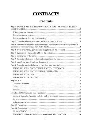CONTRACTS Contents Step 1. IDENTIFY ALL THE TERMS OF THE CONTRACT AND WHETHER THEY ARE INCLUDED 3 Written terms and signature 3 Terms incorporated by notice 3 Terms incorporated from a course of dealing 3 Step 2. Determine whether the contract is wholly or partly in writing 3 Step 3. If doesn’t include entire agreement clause, consider pre-contractual negotiations to determine if wholly in writing (State Rail v Heath) 4 Step 4. If wholly in writing, parole evidence applies (State Rail v Heath) 4 Step 5. If promissory, statement is added to the contract 4 Step 6. Construction of the terms 5 Step 7. Determine whether an exclusion clause applies to the issue 5 Step 8. Identify the term, breach and the nature of it 6 Step 9. Determine any implied terms -> have they been breached? 7 TERMS IMPLIED IN FACT (FORMAL WRITTEN CONTRACTS) 7 TERMS IMPLIED IN FACT (INFORMAL CONTRACTS) 7 TERMS IMPLIED IN LAW 7 TERMS IMPLIED IN CUSTOM 8 Step 12. ACL 8 Consumer Guarantees 8 Goods 9 Services: 9 ACL REMEDIES (remedies page 5 damian’s) 10 Consumer Guarantee Remedies (only for trade or commerce) 11 Services 12 Unfair contract terms 12 Step 13. Frustration 13 Step 14. Termination 13 BY AGREEMENT 13 TERMINATION FOR FAILURE OF A CONTINGENT CONDITION 14 TERMINATION FOR REPUDIATION 15 TERMINATION FOR DELAY 16 Step 15. Affirmation 16 Step 16. Restrictions on termination 17 Ready and Willingness 17 Waiver (Agricultural and Rural Finance v Gardiner) 18 Relief against forfeiture 18 Step 17. UNLIQUIDATED DAMAGES FOR BREACH 18 Expectation damages 19 Reliance Damages 19 Loss of chance damages 19 Step 18. LIMITATIONS TO DAMAGES 20 Causation 20 Remoteness 20 Mitigation 20 Disappointment/distress 21 Loss of bargain damages 21 Step 19. LIQUIDATED DAMAGES AND PENALTY CLAUSES 21 Step 20. ACTION FOR DEBT 22 Step 21. MISREPRESENTATION (VOIDABLE – SET ASIDE FROM THE BEGINNING) 24 Step 22. RESCISSION 26 Step 23. MISLEADING OR DECEPTIVE CONDUCT: ACL REMEDIES -> check what you want as a remedy, ACL gives damages whereas Misrepresentation is voidable 28 Step 24. MISTAKE 29 Step 25. DURESS (VOIDABLE) 32 Step 26. UNDUE INFLUENCE (VOIDABLE) 33 Step 27. UNCONSCIONABLE DEALING (VOIDABLE) 35 UNCONSCIONABLE CONDUCT: ACL – NOTE FULL LEGISLATION ON DAMIAN’S – also trade or commerce definition 35 Step 28. THIRD PARTY IMPROPRIETARY (VOIDABLE) 38 Step 29. CONTRACTS REVIEW ACT (NSW) 39