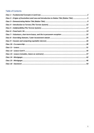 I used these notes to receive an overall mark of 80 in this course. I found them to be extremely useful to engage in CP and to complete the final exam. I have included both general reading notes from class to class and summary notes of the law for exam purposes. Notes Cover: Class 1 – Fundamental Concepts in Land Law Class 2 – Origins of Australian Land Law and Introduction to Native Title (Native Title) Class 3 – Demonstrating Native Title (Native Title) Class 4 – Introduction to Torrens (The Torrens System) Class 5 – Indefeasibility (The Torrens System) Class 6 – Fraud and s 56 Class 7 – Volunteers, short-term leases, and the in personam exception Class 8 – Overriding Statutes / Later inconsistent statute Class 9 – Caveats and competing equitable interests Class 10 – Co-ownership Class 11 – Leases Class 12 – Leases Cont’d Class 13 – Leases (remedies, leases as contracts) Class 14 – Mortgages Class 15 – Mortgages Class 16 – Easement
