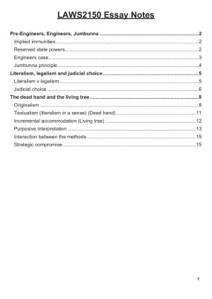LAWS2150 Essay Notes Pre-Engineers, Engineers, Jumbunna 2 Implied immunities 2 Reserved state powers 2 Engineers case 3 Jumbunna principle 4 Literalism, legalism and judicial choice 5 Literalism v legalism 5 Judicial choice 6 The dead hand and the living tree 8 Originalism 8 Textualism (literalism in a sense) (Dead hand) 11 Incremental accommodation (Living tree) 12 Purposive interpretation 13 Interaction between the methods 15 Strategic compromise 15