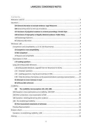 LAWS2351 CONDENSED NOTES Contents Relevance: ss55-57 4 Discretion 5 135 General discretion to exclude evidence: Legal Relevance 5 136 General Discretion to limit use of evidence 6 137 Exclusion of prejudicial evidence in criminal proceedings: Christie Style 6 138 Exclusion of improperly or illegally obtained evidence: Public Policy 7 139 Cautioning of persons 8 90 Unfairness Discretion 8 Witnesses: s28 8 Competence and compellability: ss 12-14, 18-19 (primarily) 8 12 Competence and compellability 8 13 Not competent 8 14 Reasons not compellable 9 Examination in Chief 9 s 37 Leading questions 9 Lying and Unfavourable Witnesses 9 s 38 Unfavourable Witnesses, upgrade from 32. Reluctance to testify 9 s 41 – Improper questions 10 s 42 – Leading questions: may be put to witness in XXN 10 S 44 – Only the witness themselves can be questioned about a previous representation 10 32 Attempts to revive memory in court 10 38 Unfavourable witnesses 11 Credibility: 12 102 The credibility rule (exceptions 103, 104; 108) 12 103 Exception: cross-examination as to credibility, 104 if DEF 12 104 Other protections: cross-examination of DEF 14 106 Exception: rebutting denials by other evidence 15 108 – Re-establishing Credibility 15 43 Prior inconsistent statements of witnesses 16 Previous Representation 16 Browne v Dunn 16 Exception: re-establishing credibility: s108 17 Hearsay 18 Competency: 61 dependent on competency 18 First hand Hearsay: 67: Ch9,pp328-362 19 62 Restriction to “first-hand” hearsay 19 65 Exception: Criminal proceedings if maker not available 19 66 Exception: Criminal Proceedings if maker available 20 66A: Subramaniam/Suteski 21 Examples 22 The Accused 23 Tendency and Opinion 24 Tendency Rule: 97 24 Coincidence Rule: 98 26 “Background Evidence”: can’t be used for rest of section – s95, give warning, 136 26 Character Battle Rebuttals: s110-111 27 Opinion Evidence: s76 28 Identification Evidence 29 Judicial Directions and Warnings 31 Character 32 Dictionary 33 Theory 34 Fair Trial 34 Circumstantial Evidence 34 Evidence Act Background 35 Evidence Act Overview 35