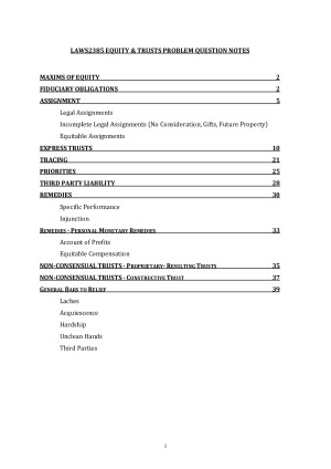 LAWS2385 EQUITY & TRUSTS PROBLEM QUESTION NOTES MAXIMS OF EQUITY 2 FIDUCIARY OBLIGATIONS 2 ASSIGNMENT 5 Legal Assignments Incomplete Legal Assignments (No Consideration, Gifts, Future Property) Equitable Assignments EXPRESS TRUSTS 10 TRACING 21 PRIORITIES 25 THIRD PARTY LIABILITY 28 REMEDIES 30 Specific Performance Injunction REMEDIES ­ PERSONAL MONETARY REMEDIES 33 Account of Profits Equitable Compensation NON-CONSENSUAL TRUSTS ­ PROPRIETARY­ RESULTING TRUSTS 35 NON-CONSENSUAL TRUSTS ­ CONSTRUCTIVE TRUST 37 GENERAL BARS TO RELIEF 39 Laches Acquiescence Hardship Unclean Hands Third Parties