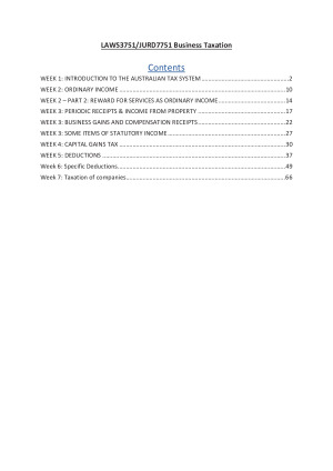 LAWS3751/JURD7751 Business Taxation Contents WEEK 1: INTRODUCTION TO THE AUSTRALIAN TAX SYSTEM 2 WEEK 2: ORDINARY INCOME 10 WEEK 2 – PART 2: REWARD FOR SERVICES AS ORDINARY INCOME 14 WEEK 3: PERIODIC RECEIPTS & INCOME FROM PROPERTY 17 WEEK 3: BUSINESS GAINS AND COMPENSATION RECEIPTS 22 WEEK 3: SOME ITEMS OF STATUTORY INCOME 27 WEEK 4: CAPITAL GAINS TAX 30 WEEK 5: DEDUCTIONS 37 Week 6: Specific Deductions 49 Week 7: Taxation of companies 66
