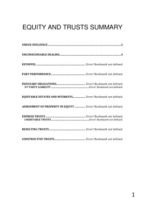 These concise, well-structured and well-formatted set of notes are perfect for the final exam. Take a look through the preview to check out all the topics covered and the quality of the notes for yourself! Topics covered include: 1. Undue Influence 2. Unconscionable Dealing 3. Estoppel 4. Part Performance 5. Fiduciary Obligations & 3rd Party Liability 6. Equitable Estates and Interests 7. Assignment of Property in Equity 8. Express Trusts 9. Charitable Trusts 10. Resulting Trusts 11. Constructive Trusts
