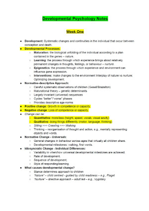Comprehensive and detailed study notes for the final exam for developmental psychology. These notes cover ALL lecture, tutorial and readings for weeks 1-13 and provide everything you need to tackle the content. Topics covered: Week 1: Introduction, Overview of Theory, & Approach to Writing a Literature Review Week 2: Prenatal Development, Genes, Environment Week 3: Physical and Perceptual Development Week 4: Cognitive Development A Week 5: Cognitive Development B Week 6: Temperament and Emotion Regulation Week 7: Emotion Regulation, Attachment and Literature Review Q&A Week 8: Contexts: Parenting, Siblings, Families Week 9: Gender Development Week 10: Moral Development Week 11: Adolescence/Adult Development Week 12: Adult Development Continued Week 13: Death and Dying