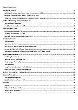 These notes cover all assessable topics in 2019 and are structured in a question response format. They include the following topics: - bringing a complaint (incl judicial review, standing, & AHRCA complaints process); - stipulated activity in a stipulated sphere (sex and disability discrimination); - protected attribute (sex and disability discrimination); - direct discrimination (incl comparator, less favourable treatment, on the ground of protected attribute, same or not materially different circumstances, reasonable adjustment); - indirect discrimination (incl condition/requirement, disadvantage, reasonableness & compliance with condition); - sexual harassment; - defences; and - remedies.