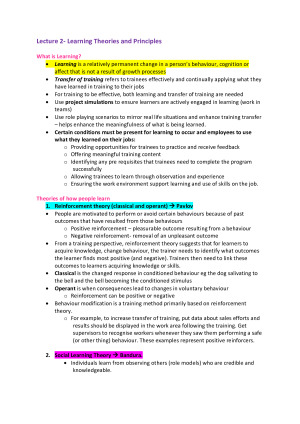 - Selling my detailed, thorough and comprehensive notes for MGMT3002 in which I achieved a Distinction. - Includes a variety of diagrams and tables which help you to understand the content better! - Headings are colour coded to break down information and topics. Notes include the following topics: Week 1: Introduction to the HRM field of learning, training and development (Chapter 1) Week 2: Theories of Learning and their application (Chapter 4) Week 3: The systematic training model 1: TNA (Chapter 3) Week 5: The systematic training model 2: Training design (Chapter 5) Week 6: Systematic training model 3: Training delivery (Chapter's 7 & 8) Week 7: Systematic training model 4: training transfer (Chapter 4) Week 8: Training Evaluation (Chapter 6) Week 9: Employee Development (Chapter 9) Week 10: Linking employee development to career management (Chapter 10) Week 11: Special issues in development: management and leadership development Week 12: Organising and marketing the HRD function (Chapter 2)