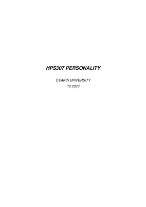 These notes are extensive, comprehensive and contain everything you'll need to know for the exam! All learning objectives are covered in clear dot-point form, from Weeks 1 to 11. They're super helpful to use when studying for the exam and to have alongside you as you learn the unit materials. Contents: Topic 1: What Is Personality? Topic 2: Dominant Theories: Biological & Trait Topic 3: Dominant Theories: Social Learning & Self-Concept Topic 4: Dominant Theories: Psychodynamic & Motivation Topic 5: Testing & Measurement Topic 6: Personality Across the Lifespan Topic 7: Personality, Health & Wellbeing Topic 8: Personality Disorders and Therapeutic Approaches Topic 9: Personality and Cognition Topic 10: Personality in the Workplace Topic 11: Personality and Culture