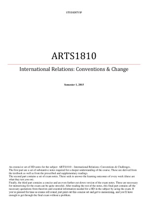 An extensive set of HD notes for the subject ARTS1810 – International Relations: Conventions & Challenges. The first part are a set of substantive notes required for a deeper understanding of the course. These are derived from the textbook as well as from the prescribed and supplementary readings. The second part contains a set of exam notes. These seek to answer the learning outcomes of every week (these are what they test you on). Finally, the third part contains a concise and an even further cut-down version of the exam notes. These are necessary for memorising for the exam which can otherwise be quite stressful. After reading the rest of the notes, this final part contains all the necessary quotations from theorists and essential information needed for a HD in the subject. If you’re pressed for time as exams roll round, just print out this concise set and get to memorising, and you’ll have enough to get through the final exam without a problem.