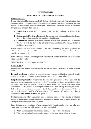 Notes covering the ENTIRE LAWS3382 course including: Introduction to private international law Personal jurisdiction International service Mandatory exercise of jurisdiction Jurisdiction clauses Forum non conveniens Lis alibi pendens Antisuit injunctions Trans-Tasman and domestic private international law Enforcement of international judgments Enforcement of Trans-Tasman and domestic judgments Choice of law method Choice of law for contract Choice of law for equity Substance/procedure distinction in choice of law Choice of law for tort Renvoi in tort and contract Proof of foreign law Received a High Distinction with a final mark of 87 for this course.