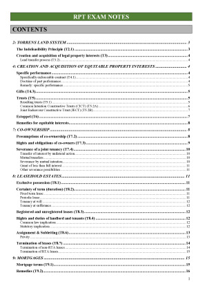 FULL SET OF NOTES PERFECT TO USE FOR EXAM Comprehensive set of RPT notes perfect to take into the exam. Includes every topic from Wk 1-12 of Real Property Law, with both the lectures and textbook readings incorporated. There are cases and authorities for almost every principle, with easy to understand and useful case summaries spread throughout the text in bright colours. There are checklists for useful information and a handy contents page at the front. Take a look at the summary to see what subjects I go through and a quick preview of the first page.