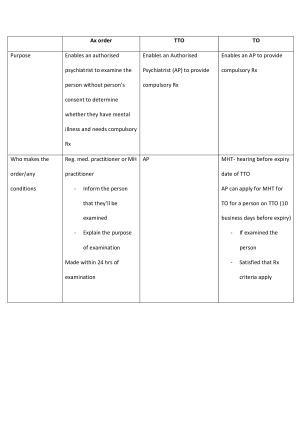 The short notes cover the following topics - Statement of rights - Privacy and confidentiality - Informed consent - Mental health tribunal - Supported decision making - Restrictive interventions - Advance statements - Electroconvulsive therapy (ECT) It also includes an extensive comparison of the assessment order, temporary treatment order (TTO), and the treatment order (TO) on their: * purpose * who makes the order & any conditions * criteria * content * setting & duration * information requirements * process & * revocation or expiry