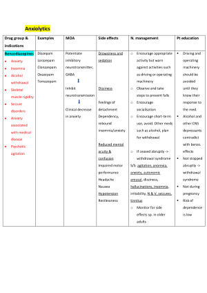 A comprehensive study of all psychotropic drug classes covered during the semester! - Anti-psychotics - Anti-depressants - Mood stabilisers & - Anxiolytics All drug classes are explored including: * their subclasses * indications * common examples * mode of action * common side effects & * nursing considerations (management & education) Notes are prepared using lecture notes and text books.