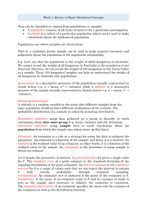These concise notes explain the steps required to approach key problems which may be assessed in the exam. These notes were personally collated to reflect the content covered throughout the semester, in order to simplify and explain concepts which may be confusing. These notes helped me get an High Distinction (92) in ETF2121/ETF5912! Not only are they fantastic for revision, but they also can help you throughout the semester. Note: the sample document only shows the Week 1 notes. The actual set of notes cover the whole semester's content as follows. Week 1: Review of Basic Statistical Concepts Week 2: Data and Sampling Week 3: Sample statistics and Inference for 1 population Week 4: Hypothesis Testing and Prediction for 1 population Week 5: Estimation and Hypothesis Testing for 2 populations Week 6: ANOVA (Comparing the mean of more than 2 populations) Week 7: Comparing Ordinal data Week 8: Simple Linear Regression Week 9: Multiple Linear Regression Week 10 and 11: Multiple Linear Regression (Further Issues)