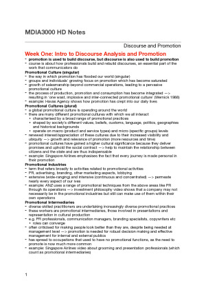 High Distinction notes for MDIA3000 Discourse and Promotion - everything you need to know for the weekly quizzes!!! The lectures are extremely long-winded and not time efficient. Use these notes for everything you'll need to know for the assessment tasks, including: - Introduction to Discourse and Promotion - Discourse Analysis and Promotion - Critical Discourse Analysis and Promotion - Multimodal Critical Discourse Analysis and Promotion - Civility in Discourse and Promotion - Ethics in Discourse and Promotion - Reason in Discourse and Promotion, and - Cultural Competence in Discourse and Promotion