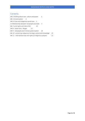 Goes through each week of relevant material in depth, first with a summary, then key points from each reading, then key points from relevant cases and legislation. Wk 2: Thinking About Race, Culture and Power Wk 3-4: Colonisation Wk 4-5: Law and Indigenous World View Wk 5-6 Relationship between Indigenous Peoples and the State Wk 7: Land Rights and Native Title Wk 8: Stolen Generations / Stolen Wages Wk 9: Indigenous Peoples and the Criminal Justice System Wk 10: Protecting Indigenous Heritage, Culture and Knowledge Wk 11: International Law and Rights of Indigenous Peoples Often Indigenous is abbreviated to 'Ind' or Aboriginal to 'Ab' Anything within '' is a direct quote from the relevant source.