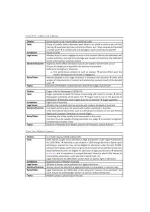 Includes ALL cases studied and set for readings in LAWS1052. EVERY CASE INCLUDES: - Title of which class it belongs to - Full Citation - Jurisdiction - Legal Issues - Decision/Outcome - Ratio/Obiter - Topics it covers CONTENT: 1. Australia's Legal System 2. Case Law 3. Statute Law - Legislation 4. Common Law + Legal Reasoning 5. Rule of Law 6. Negligence 7. Intentional Torts 8. Defences to Intentional Torts 9. Judges and Judging 10. Modern Lawyers 11. Aboriginal Dispossession and the Law 12. Mabo and Legal Change 13. Introducing Equity 14. Statutory Interpretation 15. Reading Statutes 16. The Rule of Law Today