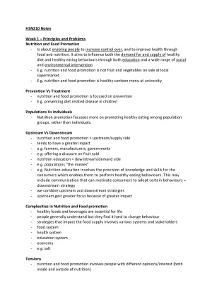 This document contains all content covered in weeks 1-10 of HSN210, summarised in an easy to follow reference. This document has been typed in an easily understandable, and simplified way. The content has been categorised weekly, which helps you isolate the content required for the weekly quizzes. Specific topics covered in this document include: - Principles and Problems - Influences on food behaviour and behavioural theories - Nutrition Program planning and evaluation and community programs - Children's Programs (problems, influences, practicalities) - Children's Programs (settings) - Nutrition Education - Mass Media and Communication - Health Services - Nutrition Promotion in Retail - Nutrition Promotion in Workplaces Additionally, this document contains easy ways to memorise important information using mnemonics and examples, which are all beneficial for exams.