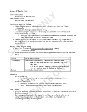 These compiled notes summarise the physiology part in HSF in a concise and clear format. They will guide you through the fundamental concepts and I prefer using tables to make the content more clearly structured and easier to comprehend. Going through them before exams would be really helpful. Hope my notes can help you achieve high marks. All the best!! BIOM20002 Topic checklist Neuromuscular 1. Membrane potential 2. Electric signalling 3. Neuronal networks 4. Muscle contraction and regulation Cardiorespiratory 1. Muscles of Cardiorespiratory function 2. Cardiac cycle 3. Blood pressure 4. Breath cycle 5. Cardiorespiratory integration Reproductive 1. Spermatogenesis and oogenesis 2. Hormonal regulation Renal 1. Overview 2. Filtration and clearance 3. Tubular function and electrolyte balance 4. Urine concentration and dilution Digestive 1. Elements of control 2. Gastric and intestinal phases