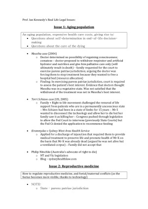 Very detailed and comprehensive up-to-date notes covering all assessable modules. Taught by Roger Magnusson. Module 1: Introduction to health and medical law Module 2: Consent to medical treatment Module 3: Professional liability Module 4: Reproduction Module 5: Withdrawal of treatment, end of life decision-making, and assisted dying Module 6: Reproductive technology Module 7: Privacy, confidentiality & access to medical information