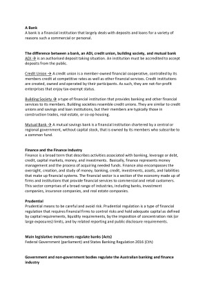Table of Contents Week 1 – Australian Banking and Finance System and Regulation 1 Week 2 – Banker and Customer Duties and Responsibilities 12 Week 2 - The Duties of Bankers 15 Week 2 - Duties of the Customer 17 Week 3 – Different Types of Account; Bills of Exchange and Cheques 18 Week 4 – Payments and Payment Systems 26 Week 4 - Wrongful Payments 31 Week 4 - Consumer Protection 32 Week 4 – ePayments Code 35 Week 5 – General principles of lending; secured lending for real and personal property Documentary Credit 36 Week 5 - Secured Lending for Real Property 39 Week 5 - Secured Lending for Personal Property 40 Week 6 – Lending Guarantees 42 Week 6 – Bankers’ Lien 47 Week 6 – Documentary Credit 48 Week 7 – Contemporary Issues in Banking Law – Key Definitions 50 Week 7 – General Law Duty of Care 53 Week 7 – Fiduciary Duties 54 Week 7 – Regulation of Financial Service Providers 55 Week 7 – Regulation of Financial Products: Disclosure Requirements and General Consumer Protection 57 Week 7 – Prohibition of Unconscionable Conduct, Misleading or Deceptive Conduct and False or Misleading Representations 59 Week 7 – ASIC Enforcement 60 Week 8 – Bankruptcy Act and Insolvency Basics 61 Week 8 – Duties and Powers of Trustees and Effect of Bankruptcy 67 Week 8 – Acts of Bankruptcy 68 Week 8 – Doctrine of Relation Back 69 Week 8 – Bankrupt Transactions and Property 70 Week 8 – Payment of Debts 73 Week 8 – Annulment, Discharge and Alternative Options 74 Week 9 – Introduction to Insurance Law and the Regulatory Regime 77 Week 9 – Insurance Contracts and Formation 78 Week 9 – Basic Concepts of Insurance Law 82 Week 9 – The Insurance Policy and Its Terms 87 Week 9 – Insurance Agents and Brokers 91 Week 9 – Particular Classes of Insurances 92 Week 10 – Introduction to Superannuation and Basic Concepts 94 Week 10 – Types of Superannuation Structures 98 Week 10 – Contributing to Superannuation 101 Week 10 – Managing Superannuation 106 Week 10 – Superannuation and Taxation 111 Week 10 – Withdrawing Superannuation 112 Week 11 – Introducing Economic Crisis 115 Week 11 – The Global Financial Crisis 116 Week 11 – The Royal Commission into Misconduct in the Banking, Superannuation and Financial Services Industry 117 Tutor/ Lecturer: Konrad Bohleke