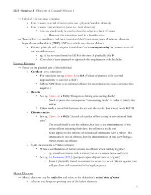 Incredibly comprehensive and extensive notes from ALL seminars, including content from assigned readings and relevant cases. Very good notes to use a substitute for lectures. Very useful to supplement your on-call tutorials. These notes have all content from class discussions and problem questions explained. I used these notes to get 100% for tutorial participation. The notes have relevant cases explained with the material facts and judgement. The nots also have scaffold for topics to guide answers to problem questions. These notes contain ALL topics, including: Introduction to Criminal Law; Principles of Criminal Law; Elements of Criminal Offences I & II; Homicide I & II; Assault and Wounding; ABH and GBH; Sexual Offences; Sexual Assault; Larceny; Complicity; Extreme Provocation; Self-Defence; Duress and Necessity; Mental Illness and SIAM; Automatism and Involuntariness; Intoxication.