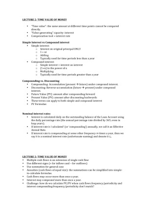 - The attached notes adequately cover all weeks (weeks 1-13). - Theories and concepts are explained comprehensively, while maintaining a clear and concise structure. - Notes include diagrams that further assist in explaining content. - Notes are enticing and eye-catching due to reasonable amount of colour and styling. - Notes cover all content required for assessments. - All information has been reliably sourced. - Notes have guided me to achieve D-HD level results on assessments. Topics Covered: - FINANCIAL SYSTEMS AND INTEREST RATES - TIME VALUE OF MONEY - PV OF PERPETUITIES - FUTURE VALUE - BONDS - SHARES - CAPITAL BUDGETING - RISK AND RETURN - DEBT AND EQUITY